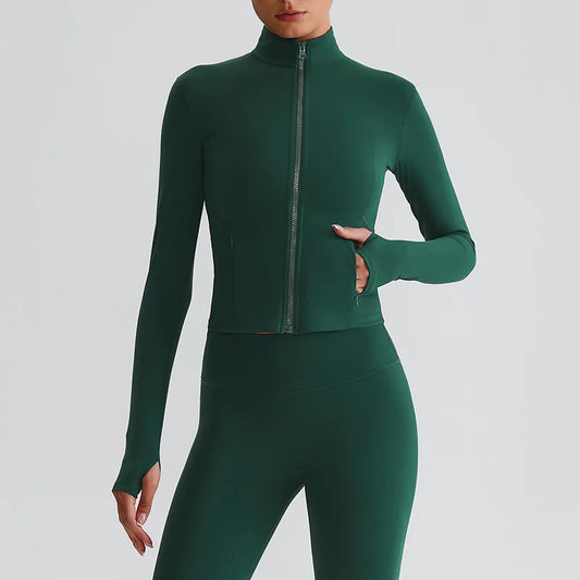 Solid Color Women Sport Jacket Long Sleeve Zip Gym High Neck Zipper With pocket Coat Fitness Top Comprehensive Training Sportwea
