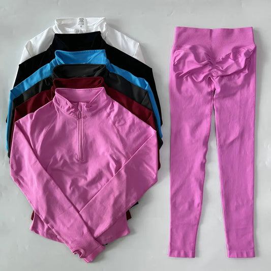 Women 2pcs Yoga Sets Long Sleeve Jacket Sport Top With Half Zip High Waisted Leggings Fitness Suits Seamless Running Workout Set