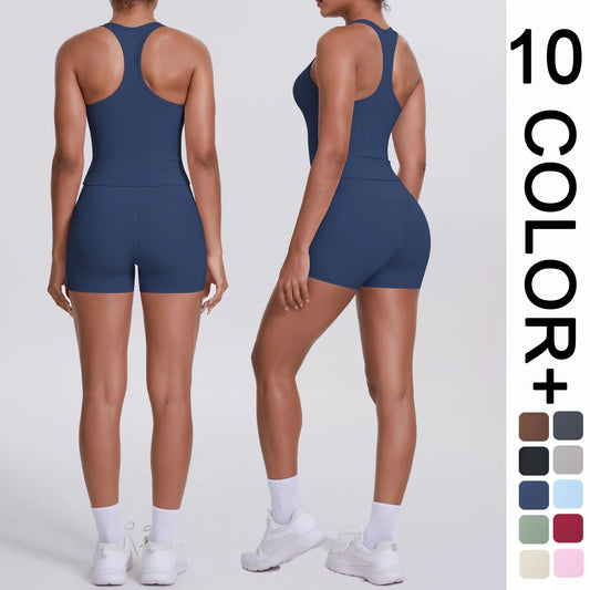 Woman Yoga Vest Shorts Set Solid Color Backless Sport Fitness Clothing Quick-Dry Hip Push Up Breathable Yoga Shorts Short Sleeve