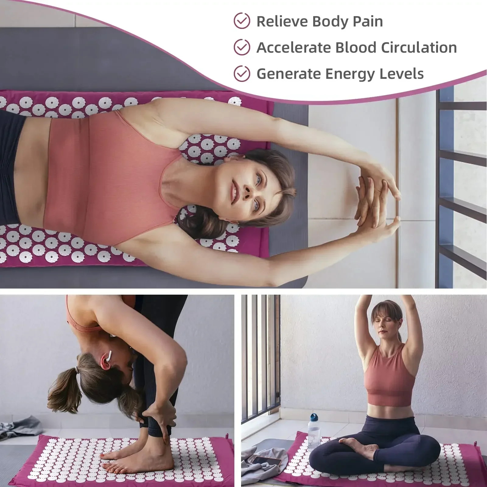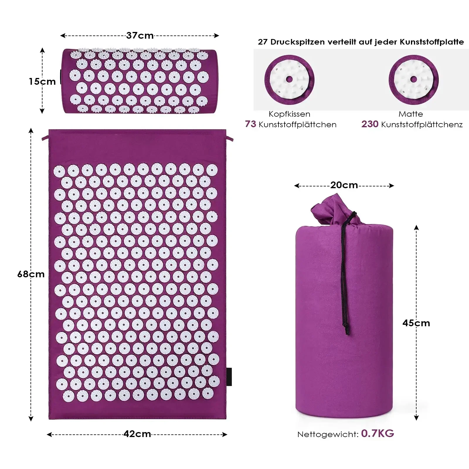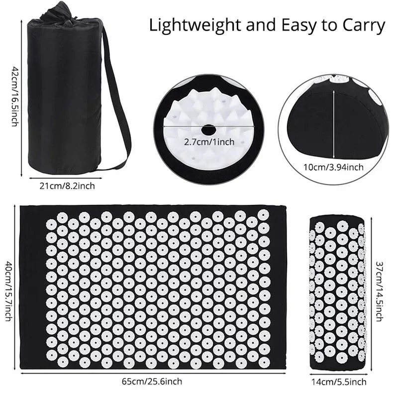 Mat Size: 66*40*2 cm Pillow Size: 37*14*9 cm Material: Eco-friendly cotton + pvc Function: Pain reduction – Naturally reduce muscle tension, back pain, and headaches by simply lying on the mat daily for 10-30 minutes
