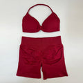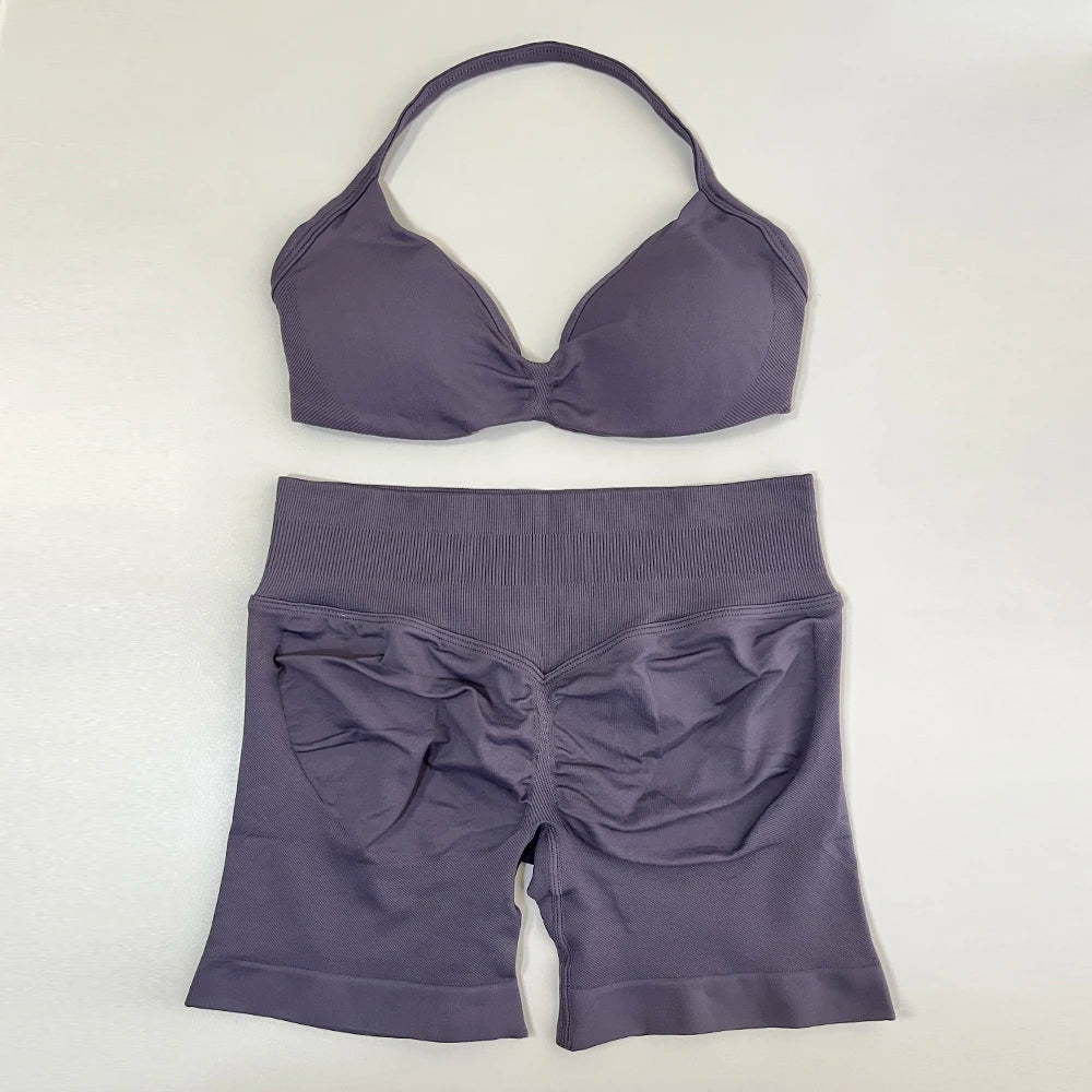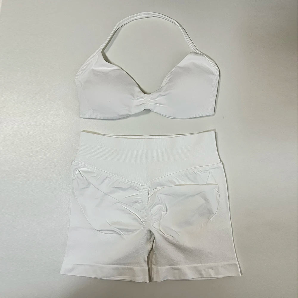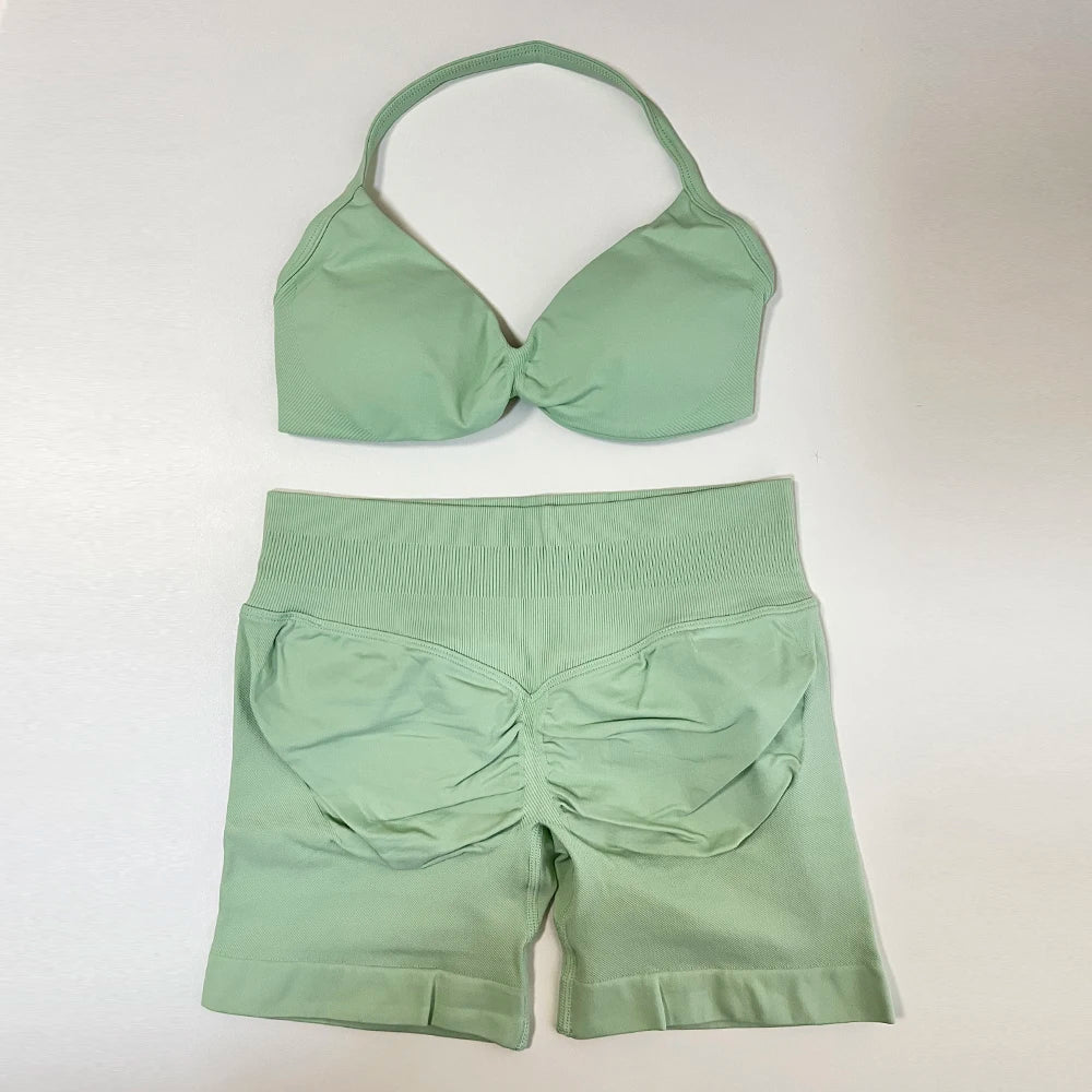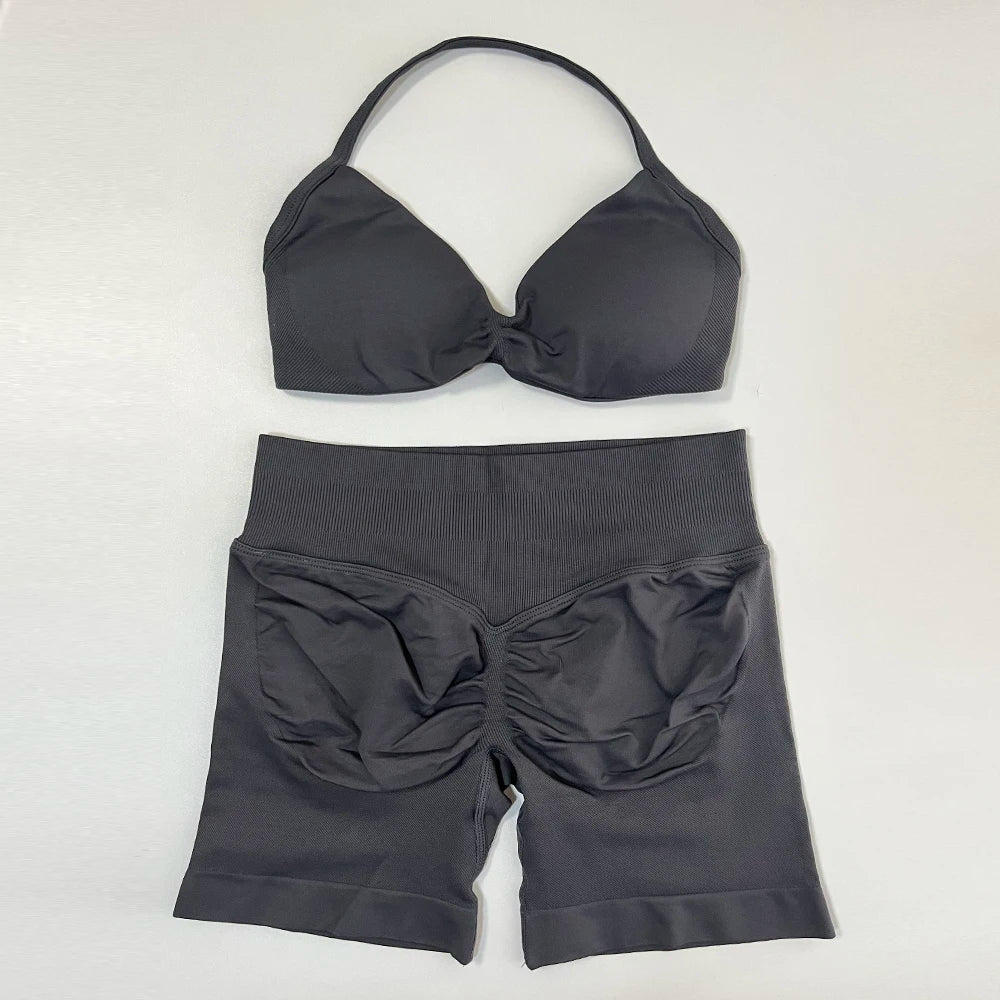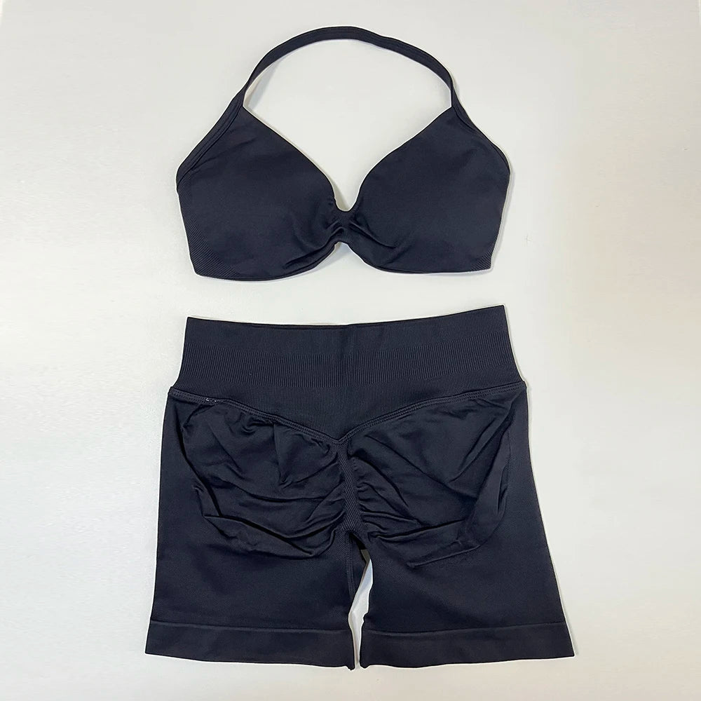 2 Piece Yoga Set Women Seamless Gym Set Strappy Halter Yoga Bra and Scrunch Bum Gym Shorts Sport Suit Sportswear Workout Set