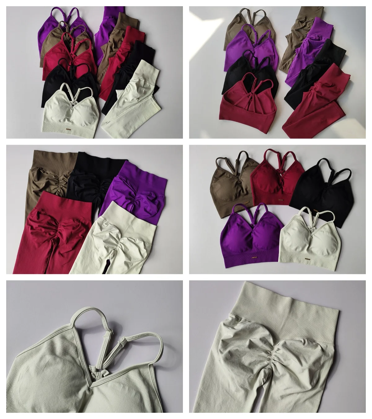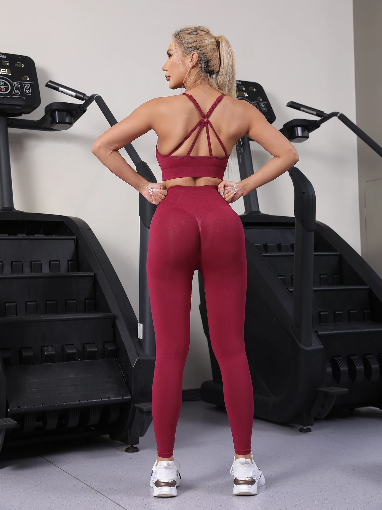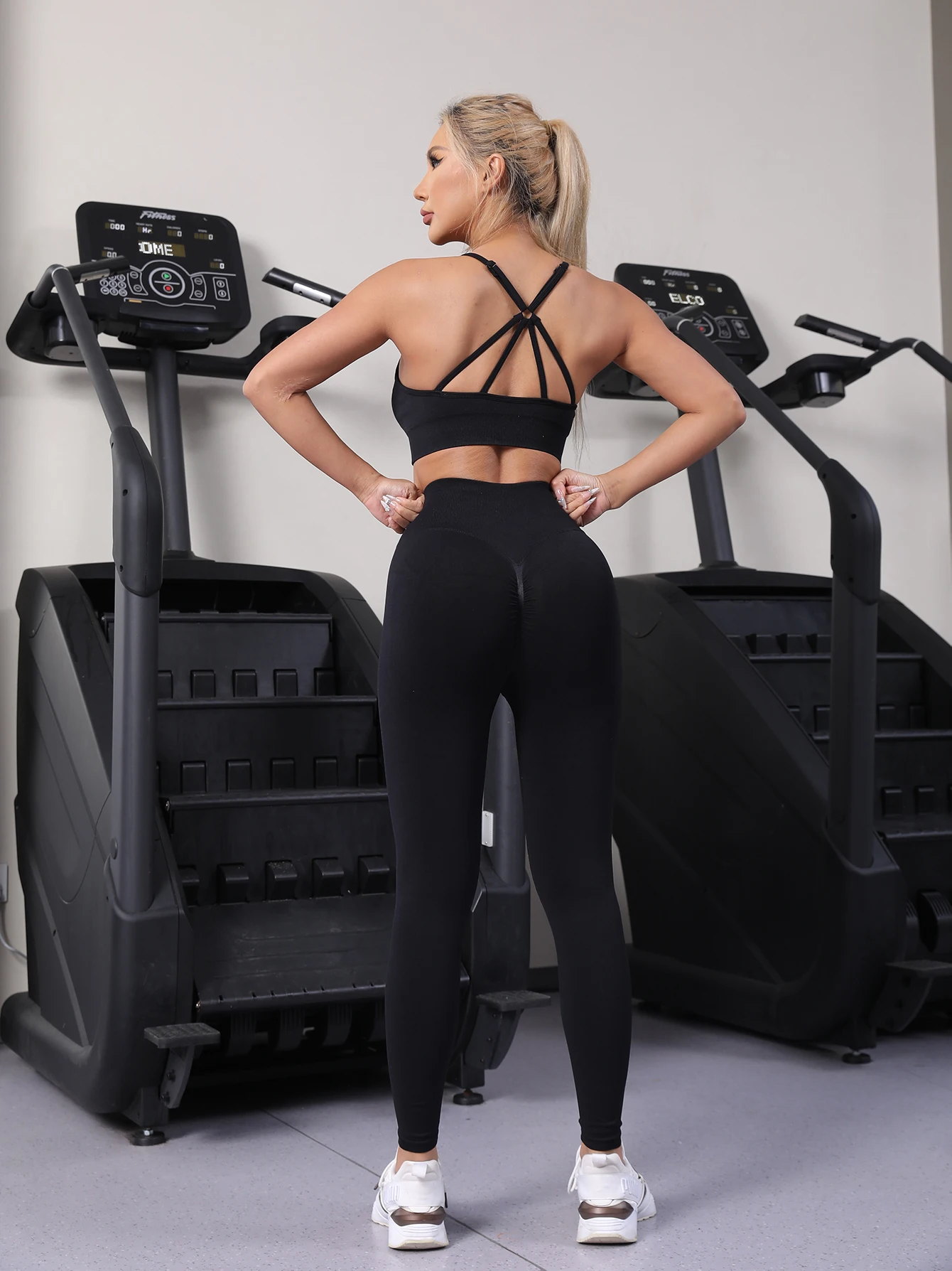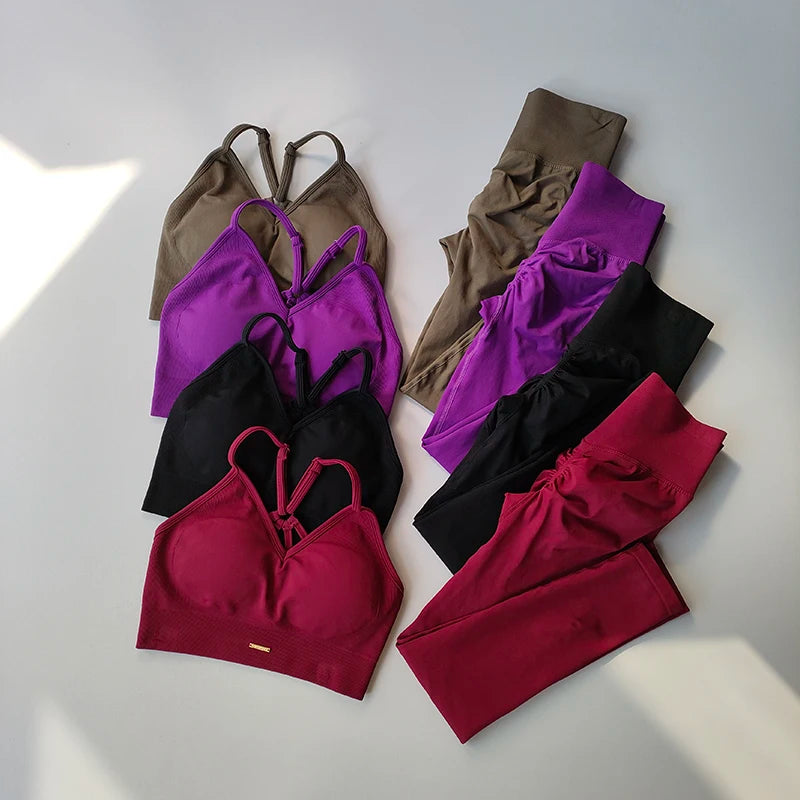 2PCS Women's Seamless Yoga Set Strappy Sports Bra with Pads & High Waisted Leggings Workout Outfit Quick Dry Gym Suit