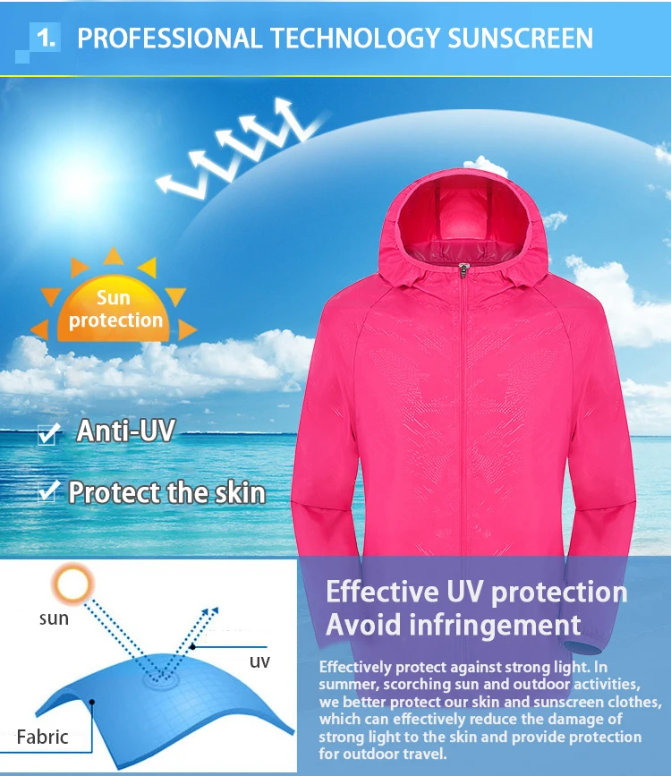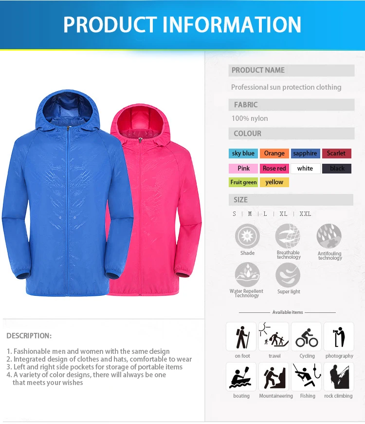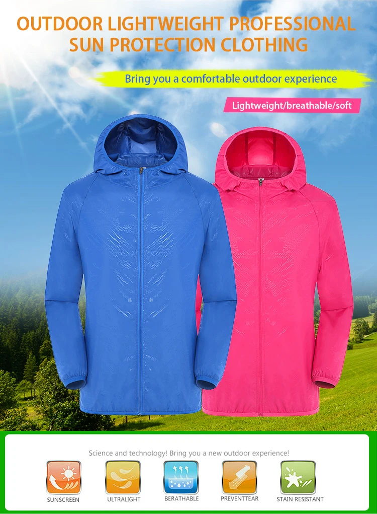 Lightweight, soft and sunscreen skin jacket with storage bag, compact and easy to carry, 11 colors to choose from. Suitable for outdoor sports such as hiking, camping, running, fishing, and cycling.