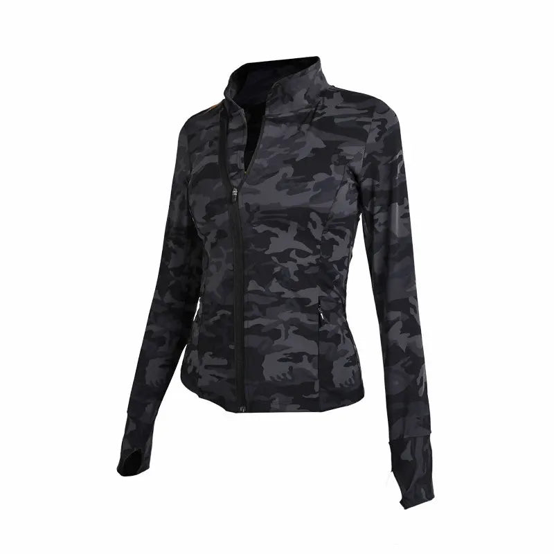 Camo Sports Jacket with Thumb Hole Gym Fitness Sportswear Running Top Long Sleeved Outerwear Yoga Camouflage Bomber Jacket Women