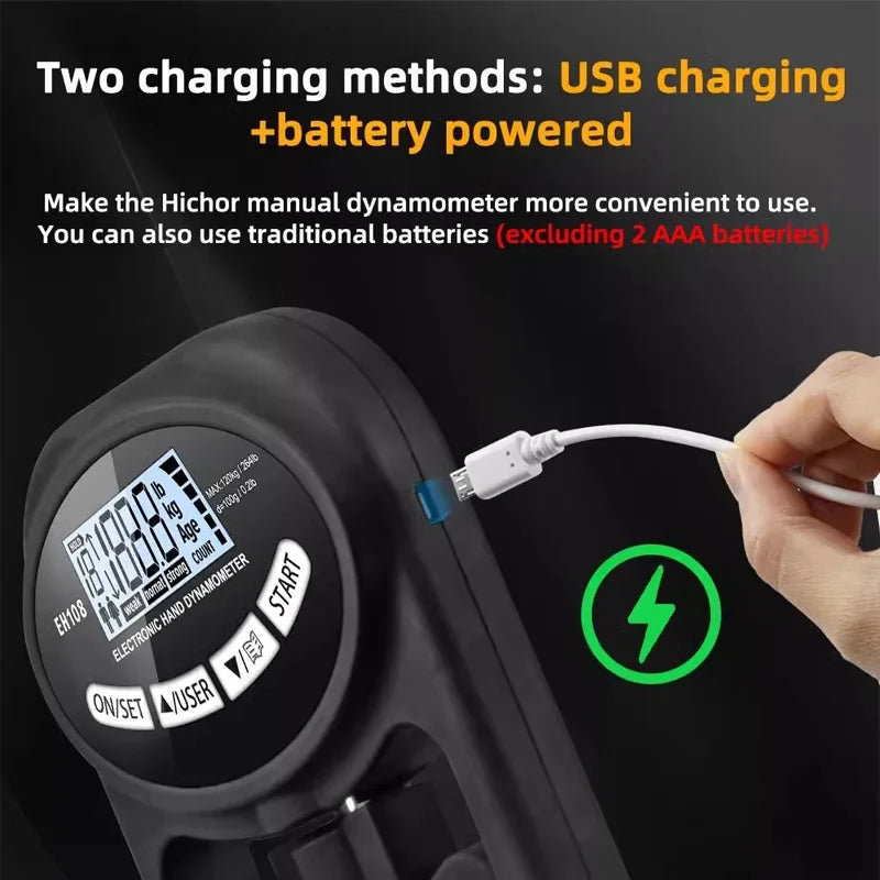 [Bright Screen Display & USB Charging]The newly upgraded bright screen function of grip strength tester allows you to clearly see the readings of the grip strength tester in a dark environment. It can be recharged with a USB cable, which is more environmentally friendly. Traditional AAA batteries (Not included) can also be used.