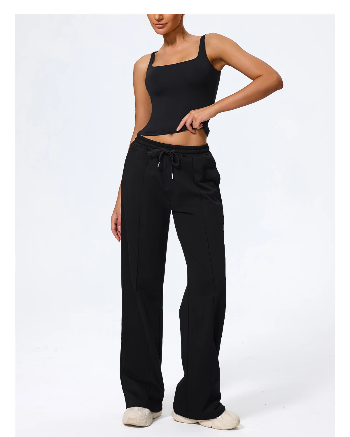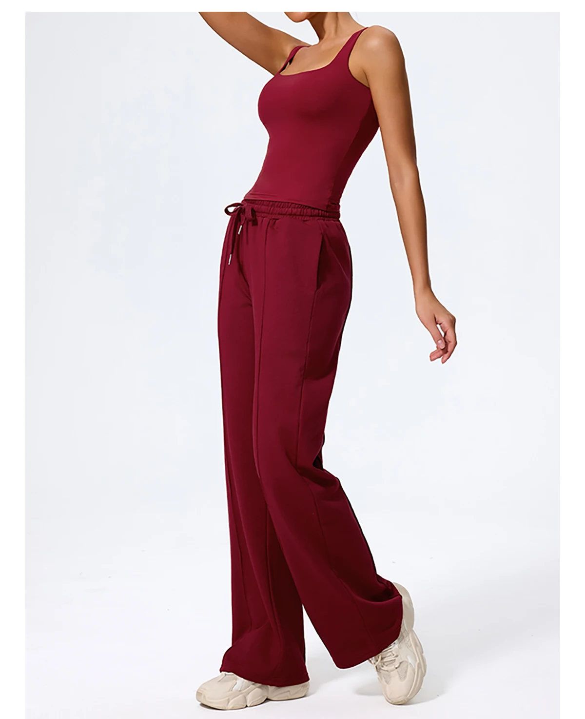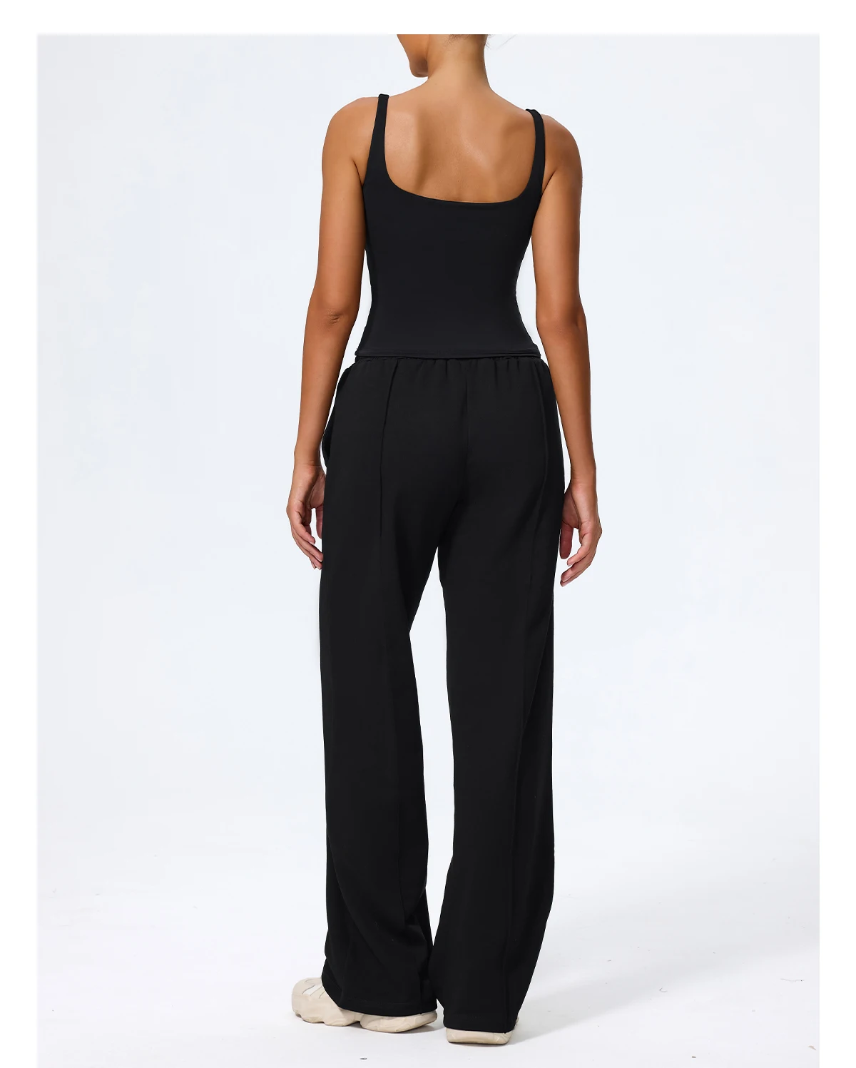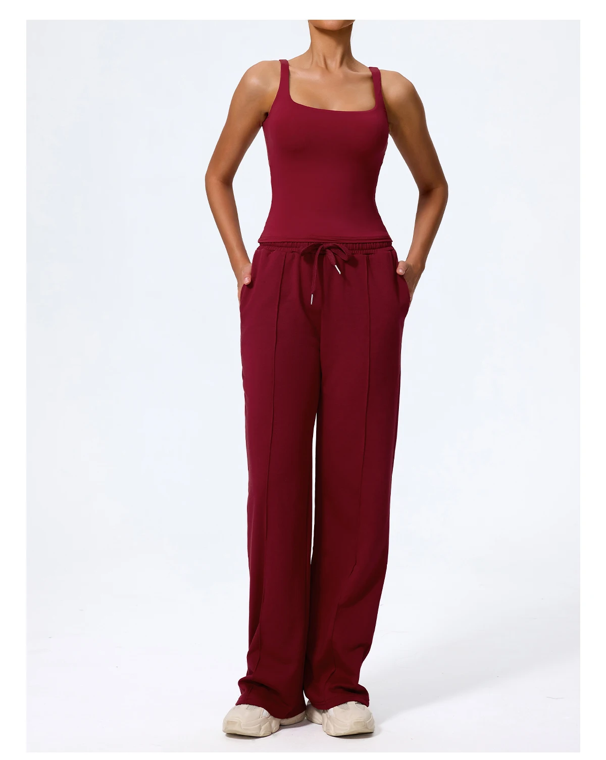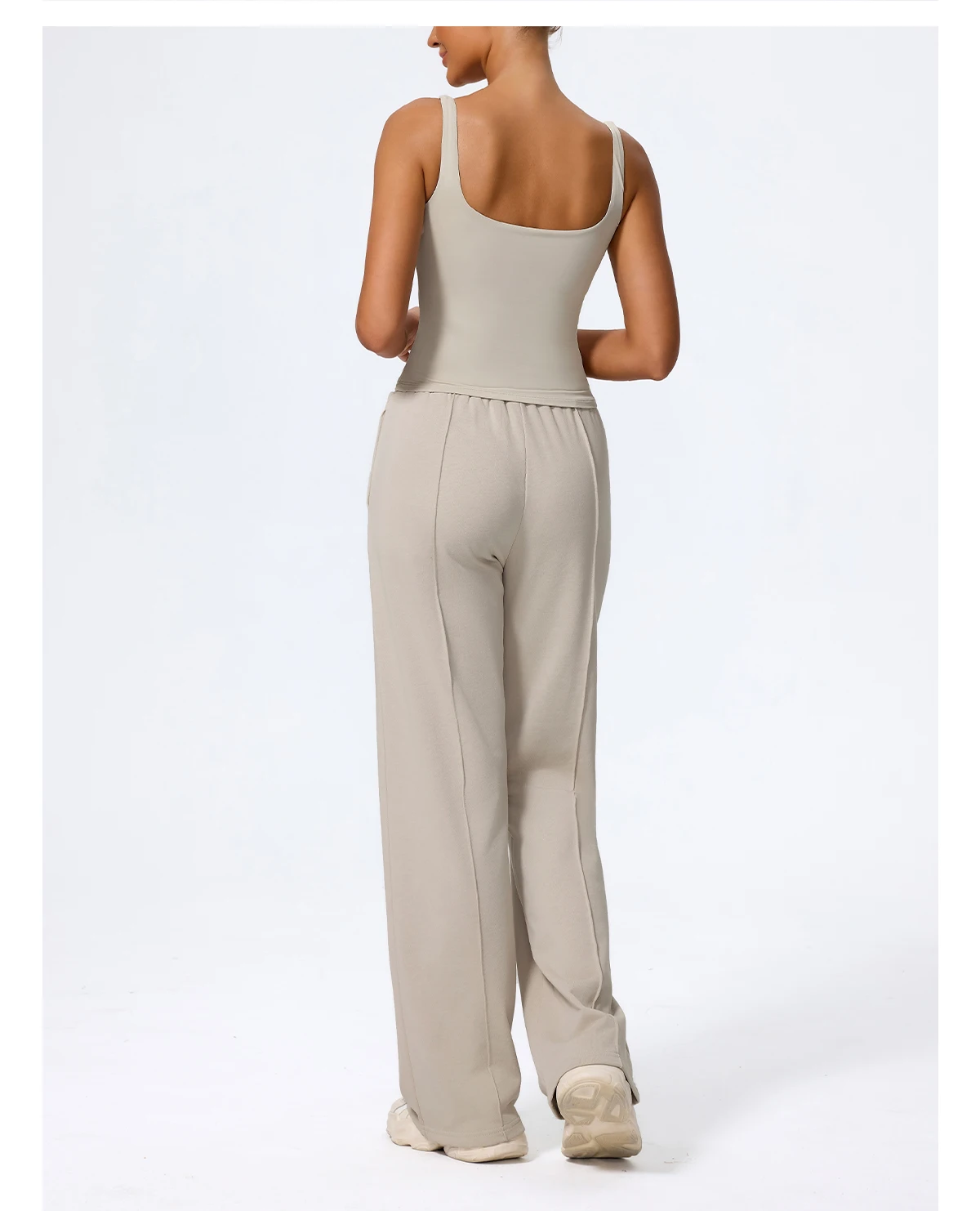 Hearuisavy 2Pcs Women Straight Fit Sweatpants Set Casual Outdoor Running Workout Yoga Vest Drawstring Pocket Sport Pants Female