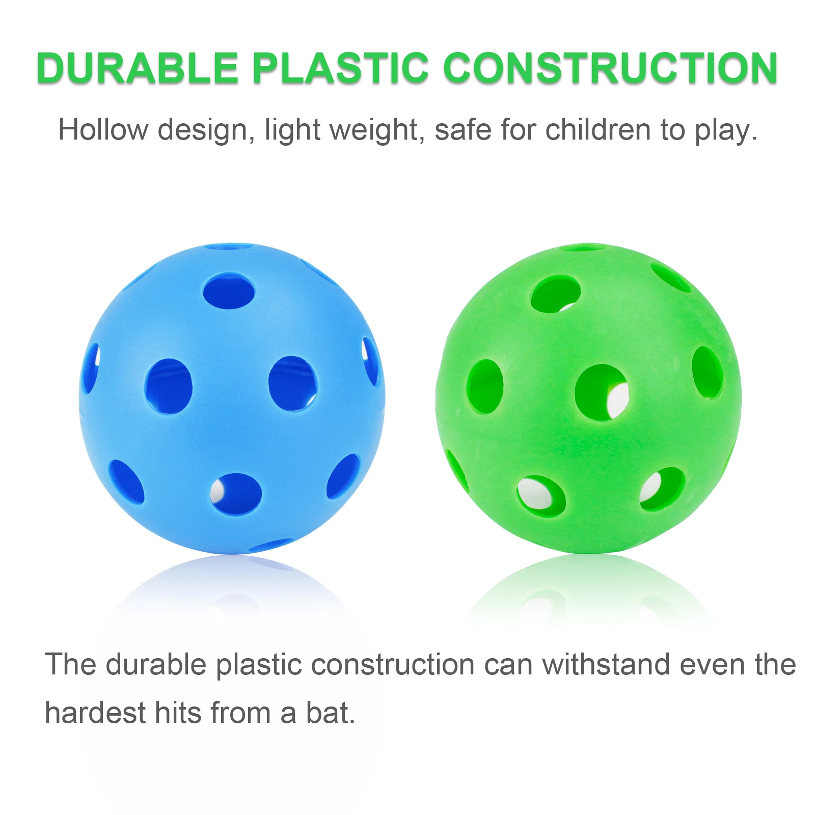 (2) Durable Ball: These baseballs are made from hight quality durable plastic material which allows them to pop back into their original shape after they're hit. They are more durable than traditional plastic training baseballs.