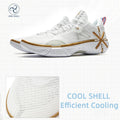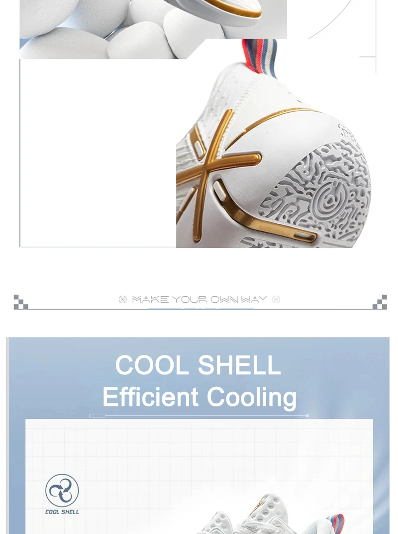 COOL SHELL: COOL SHELL is a technology that comprehensively solves the problem of rising foot temperature during exercise. Through the breathable structure of the Ice Fiber temperature controlled inner lining, tongue, body, and sole, a comprehensive breathable cooling system is formed, providing efficient cooling effect.According to SGS professional testing, the ice yarn lining material used by Li Ning COOL SHELL has an 80% higher temperature reduction ability than ordinary lining materials.