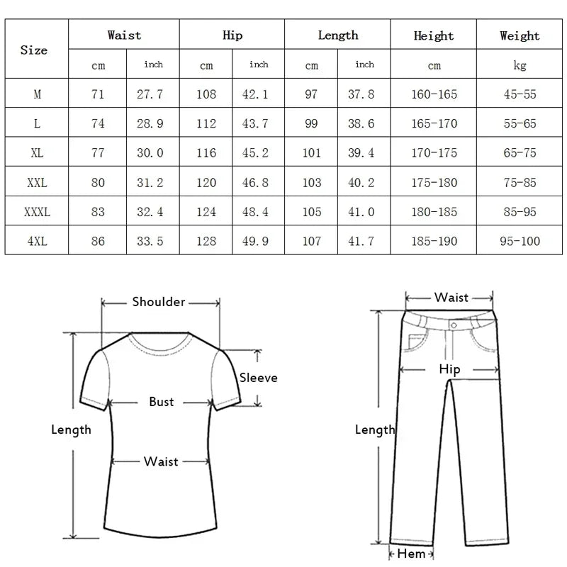 4XL =Waist 86cm , Length 107cm, Hip 128cm ,For Weight 95-105kg Height 185-190cm;
