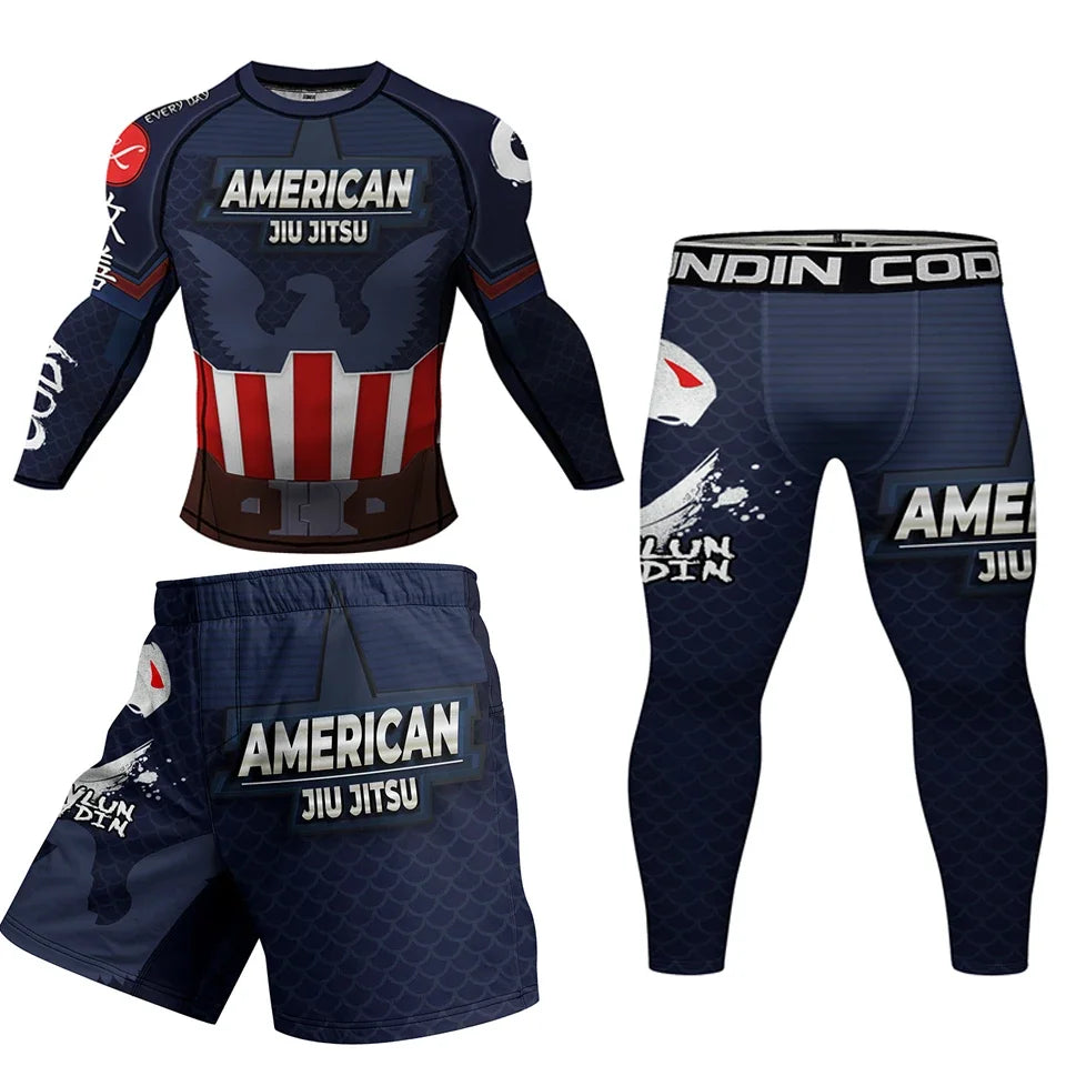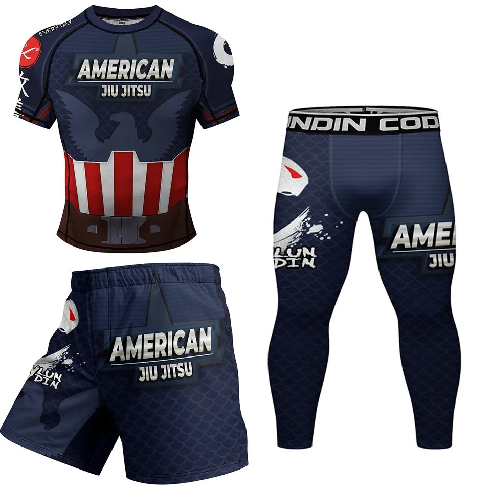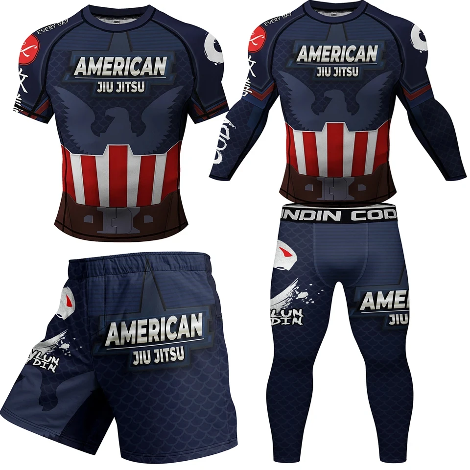 New Jiu Jitsu T-shirt +Pant 4pcs/set Rashguard Men Bjj Gi Brazilian Grappling MMA Muay Thai Shorts Gym Sport Clothing Sportswear