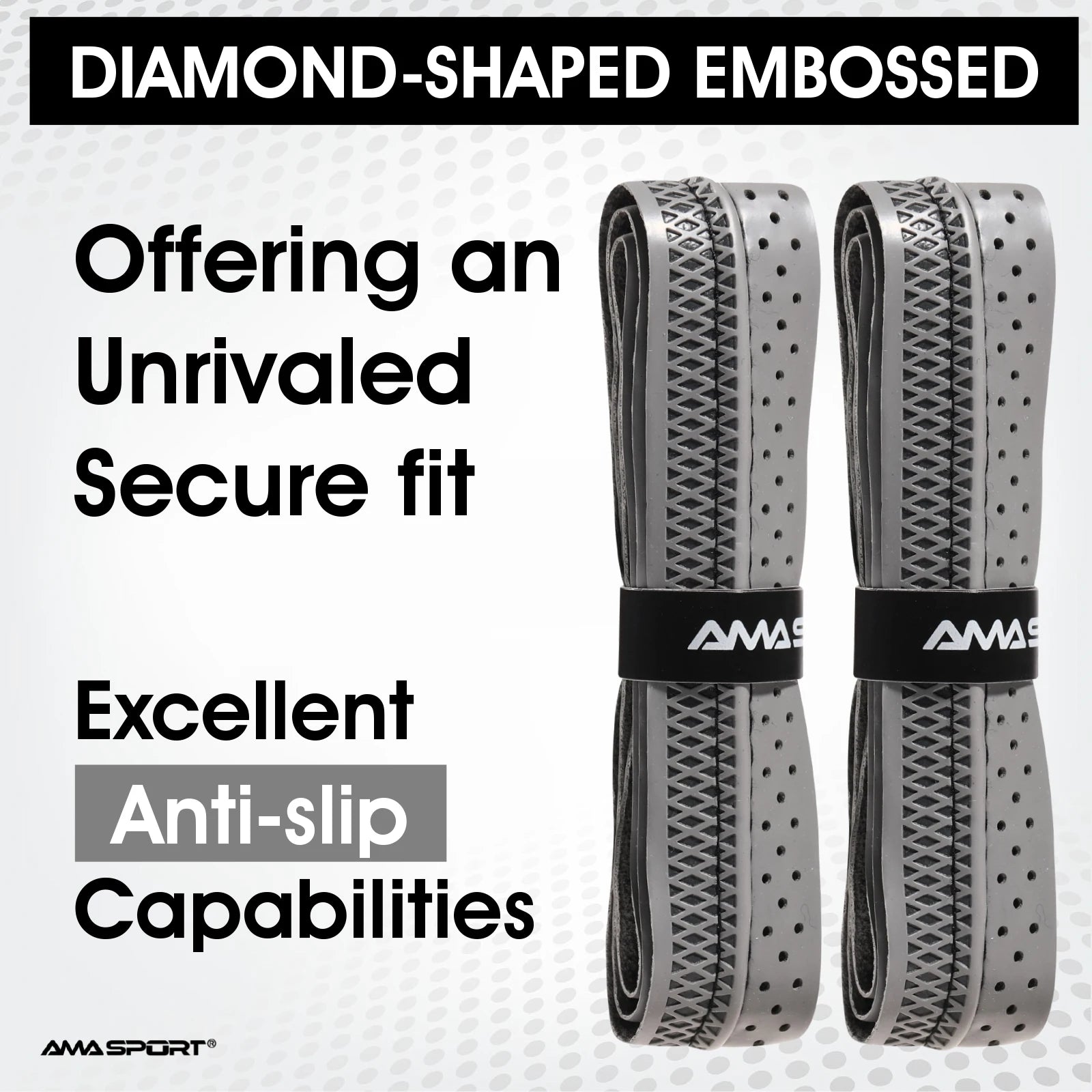 1.DIAMOND-GRIP TECH - Our grips feature a diamond-shaped embossed pattern, offering an unrivaled secure fit and easy adjustability, ensuring your grip remains steady through every serve and volley.