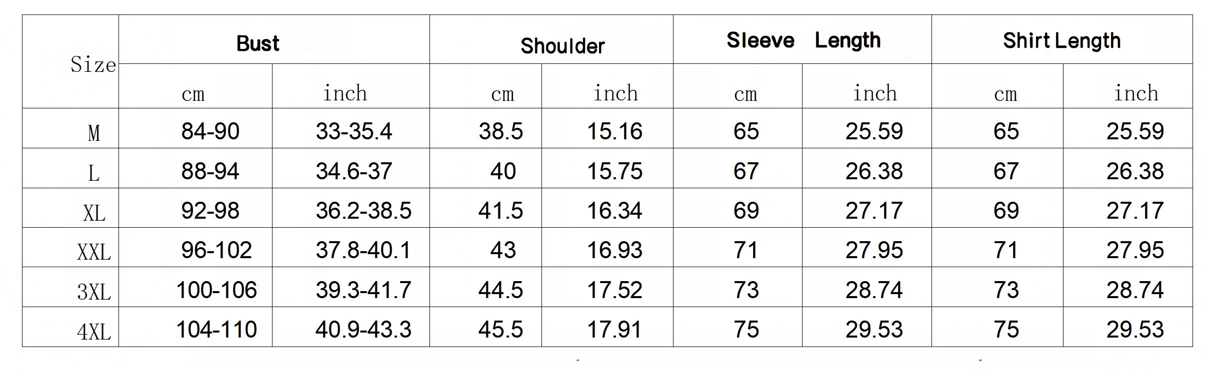 4XL:==Bust (104-110cm/40.9"-43.3) Length (75cm/29.5") Height(185-200cm) Weight(95-105 kg)