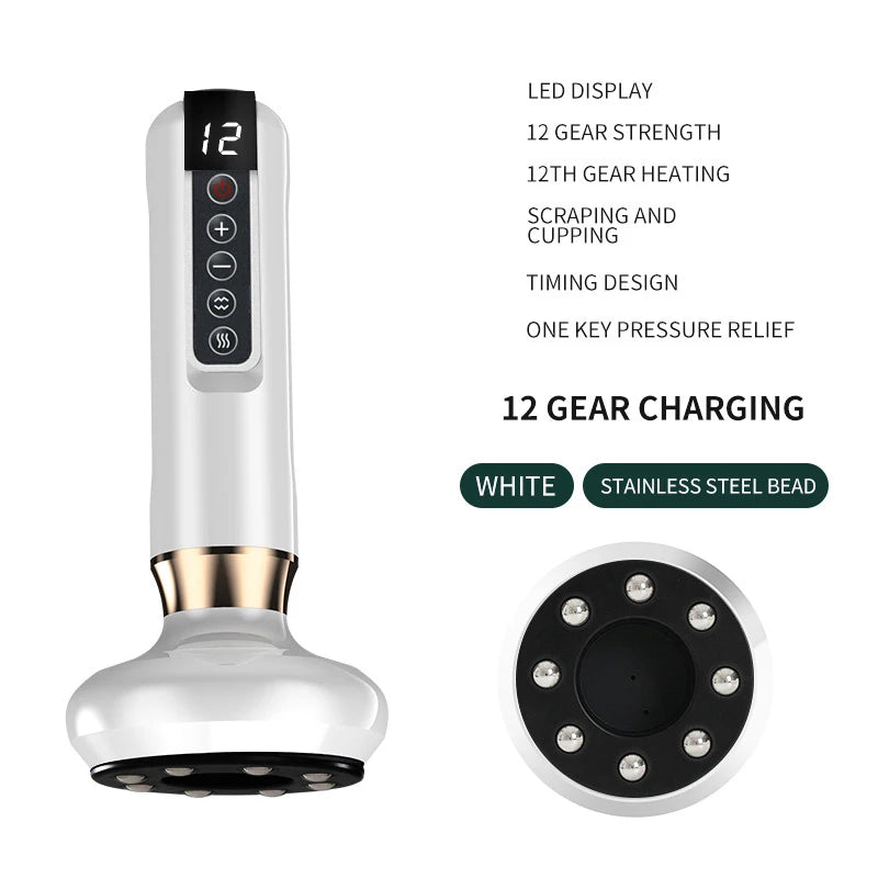 Function : Scraping + Cupping Massage, 12 Levels of adjustable suction, One-key pressure relief, 45-50 ℃ constant temperature Infrared heating,Timing function.