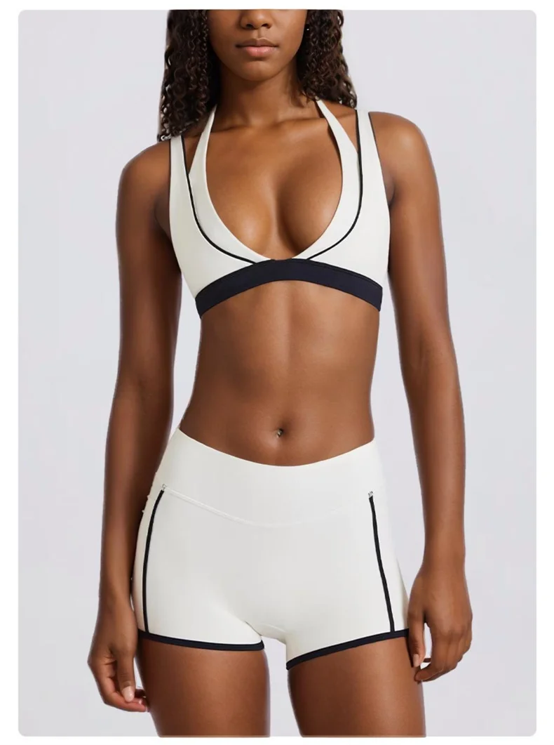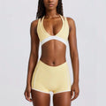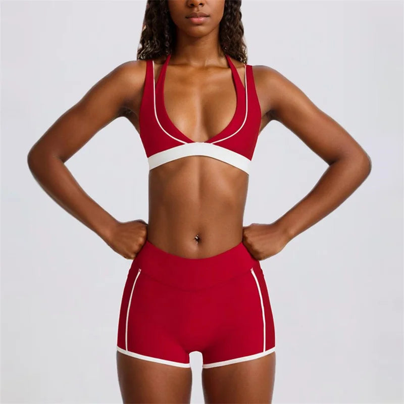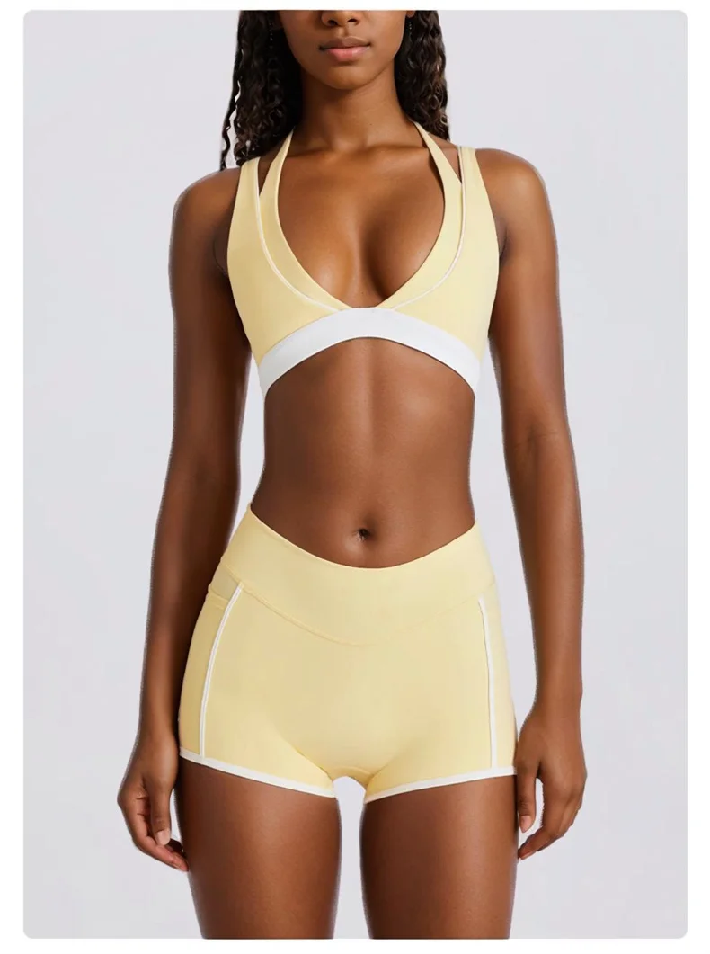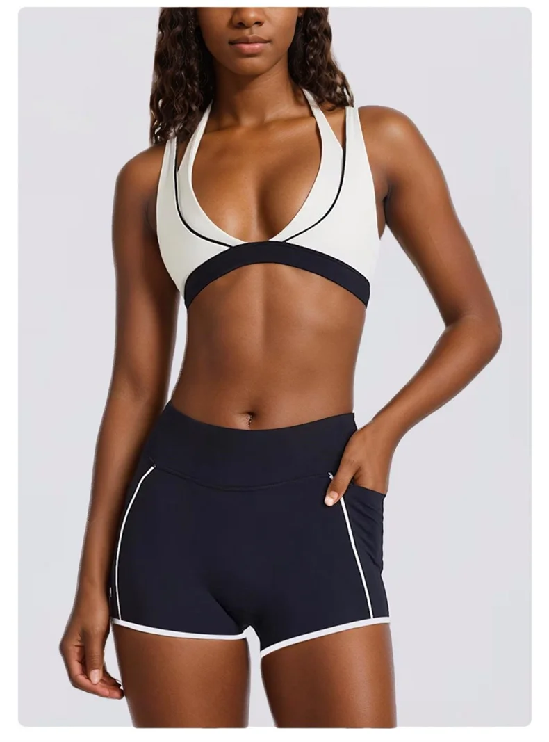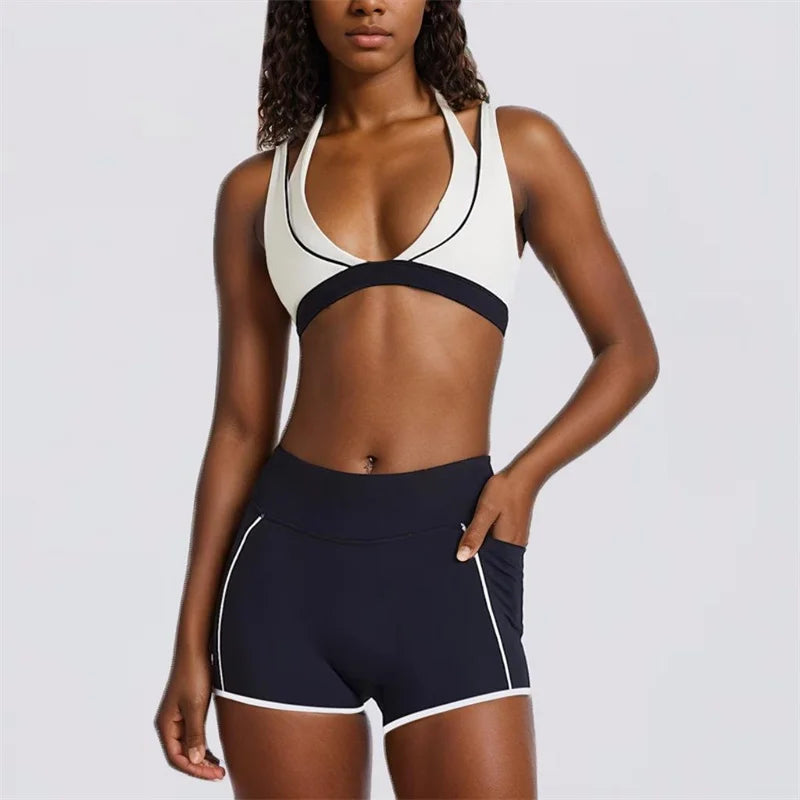 SVEIC Yoga Shorts Sets Fake Two-Piece Sports Bras V-Neck Hanging Neck Fitness Contrast Color Workout Running Gym Woman Clothing