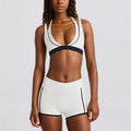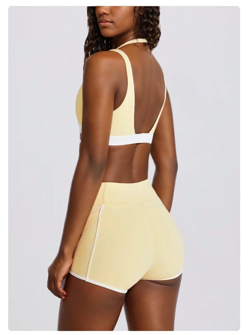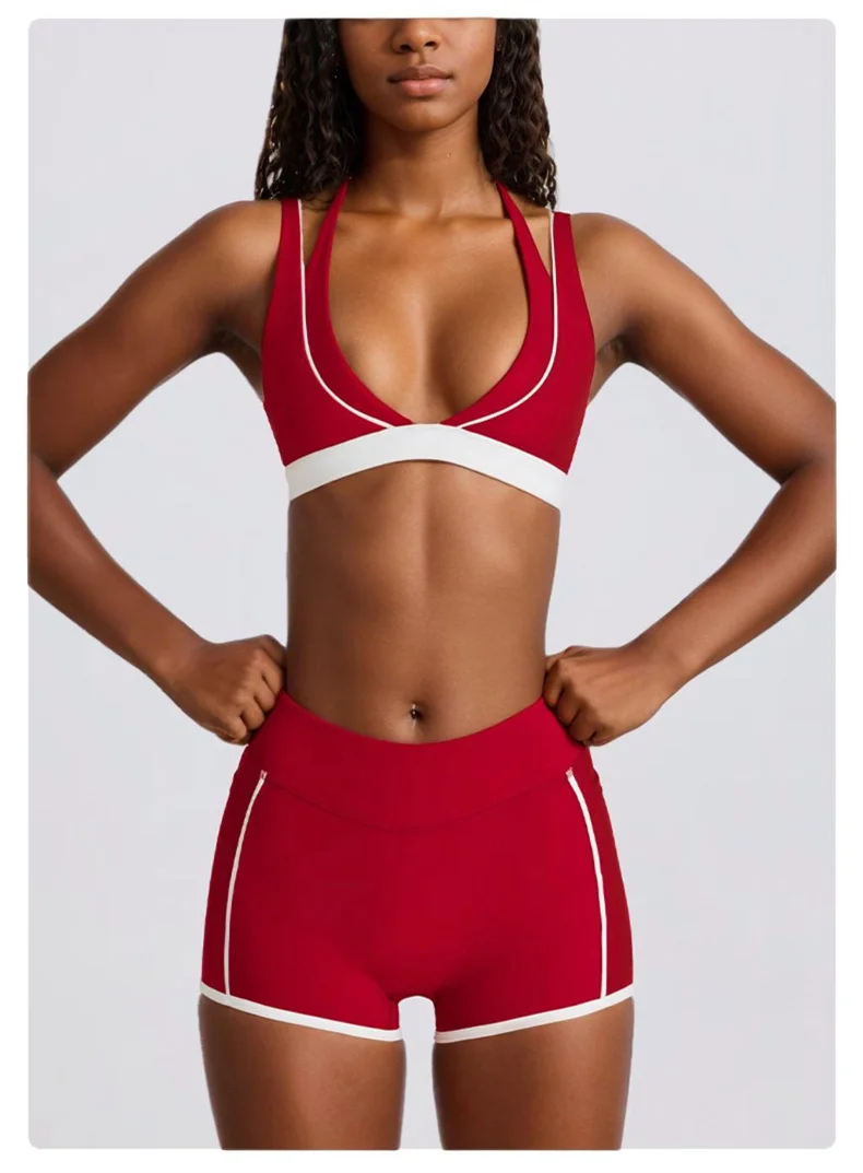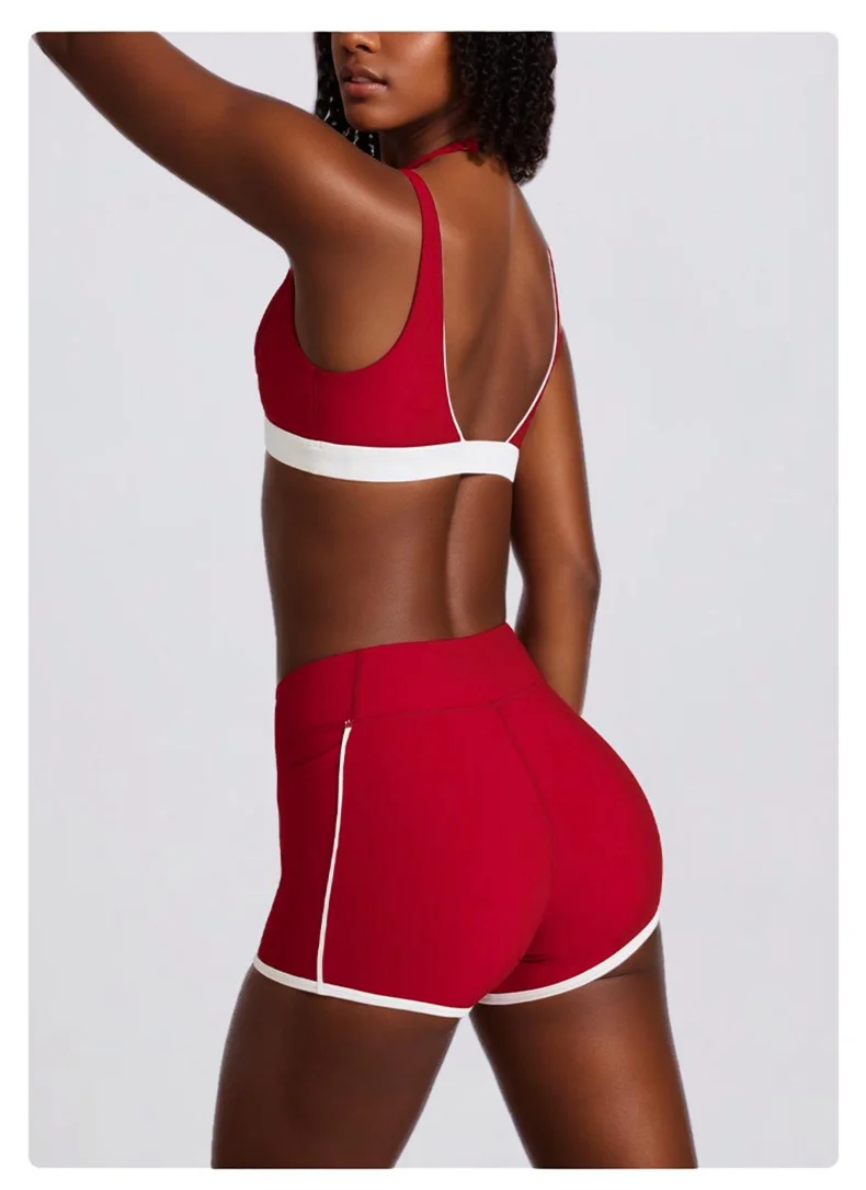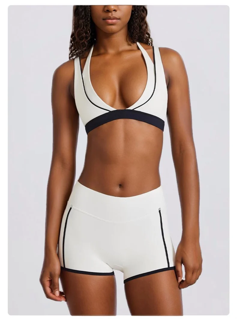SVEIC Yoga Shorts Sets Fake Two-Piece Sports Bras V-Neck Hanging Neck Fitness Contrast Color Workout Running Gym Woman Clothing