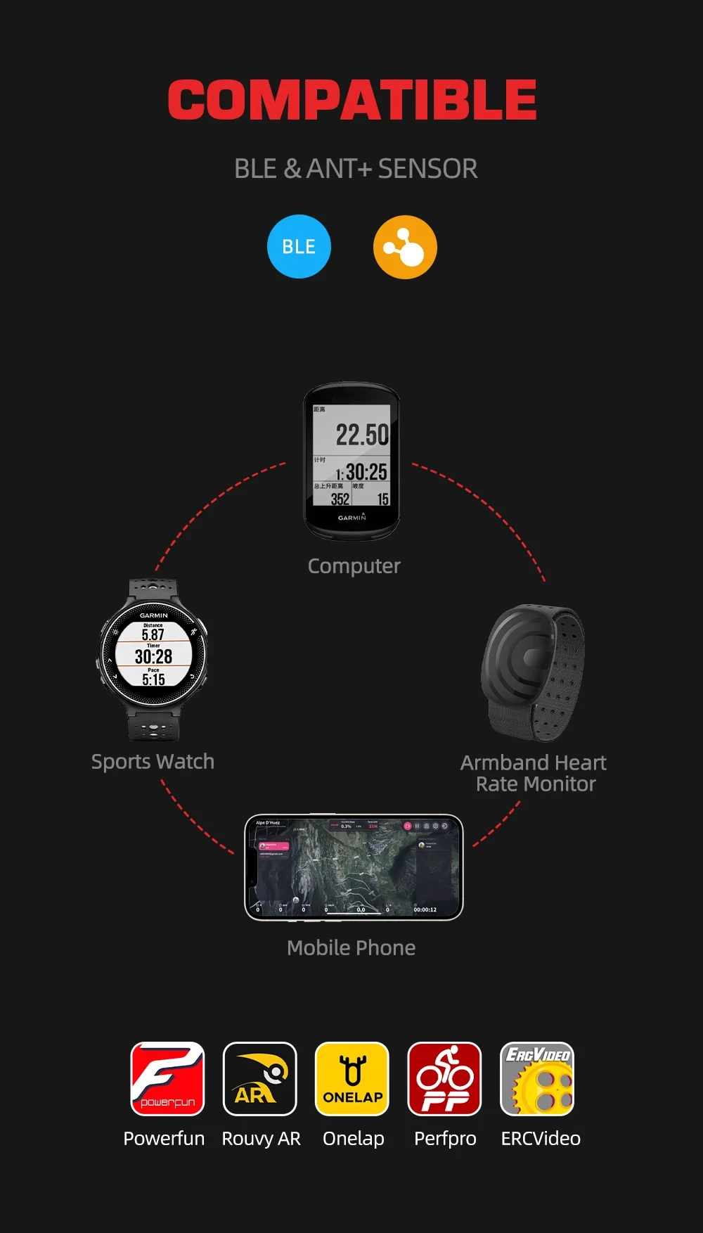 1) ANT+: Compatible With ANT+ bike computers, wathches and cycling software:SRM Power control, Garmin, Bryton, iGPSPORT, PerfPro,etc.