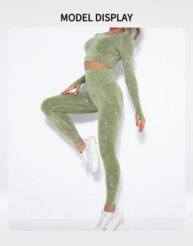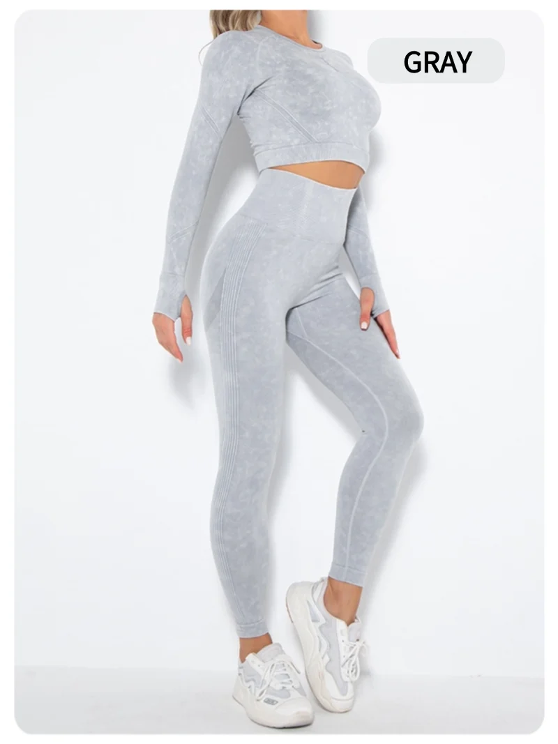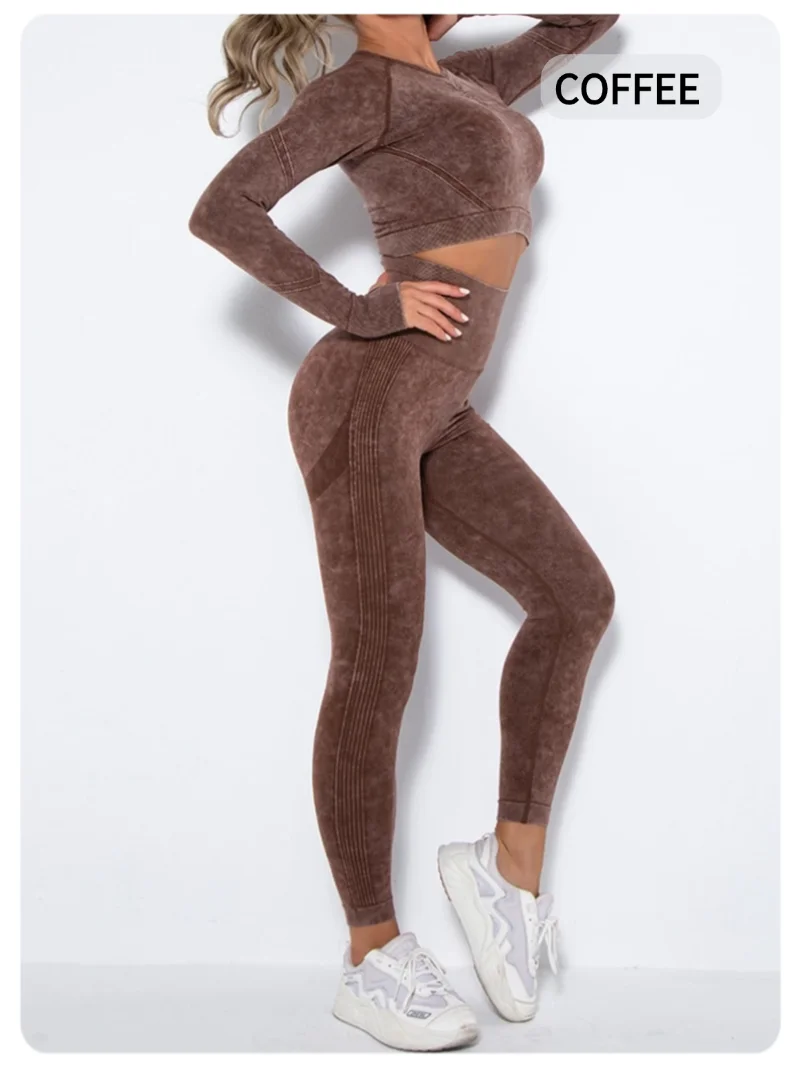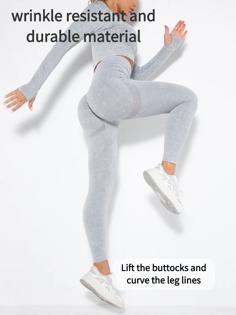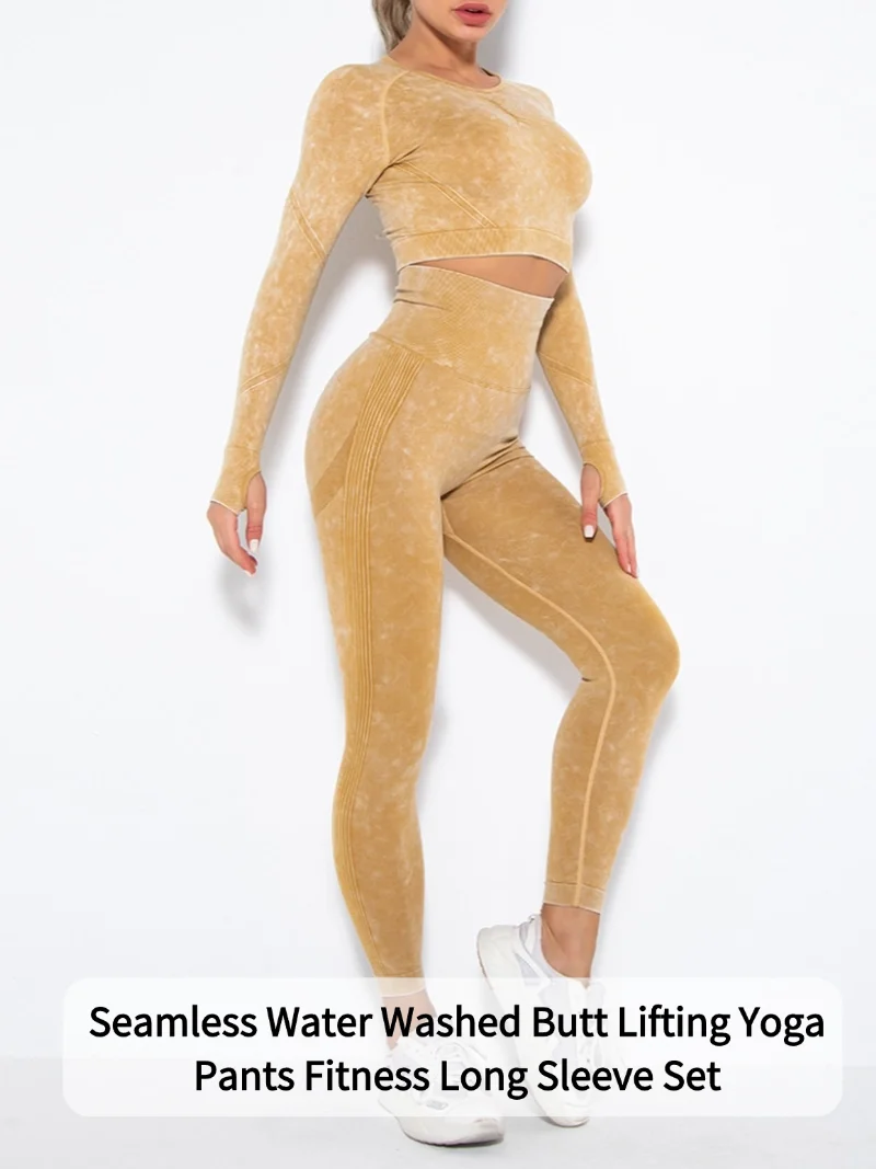 Women's New Seamless Washed Smiling Face Yoga Set, Sports Fitness Long Sleeved Top, Hip Lifting Yoga Pants Two-piece Set