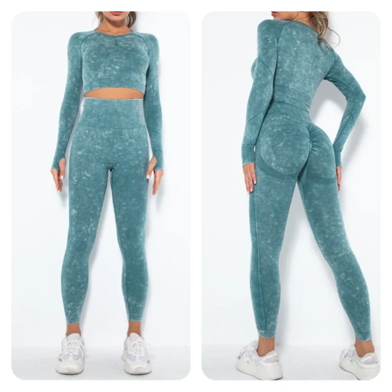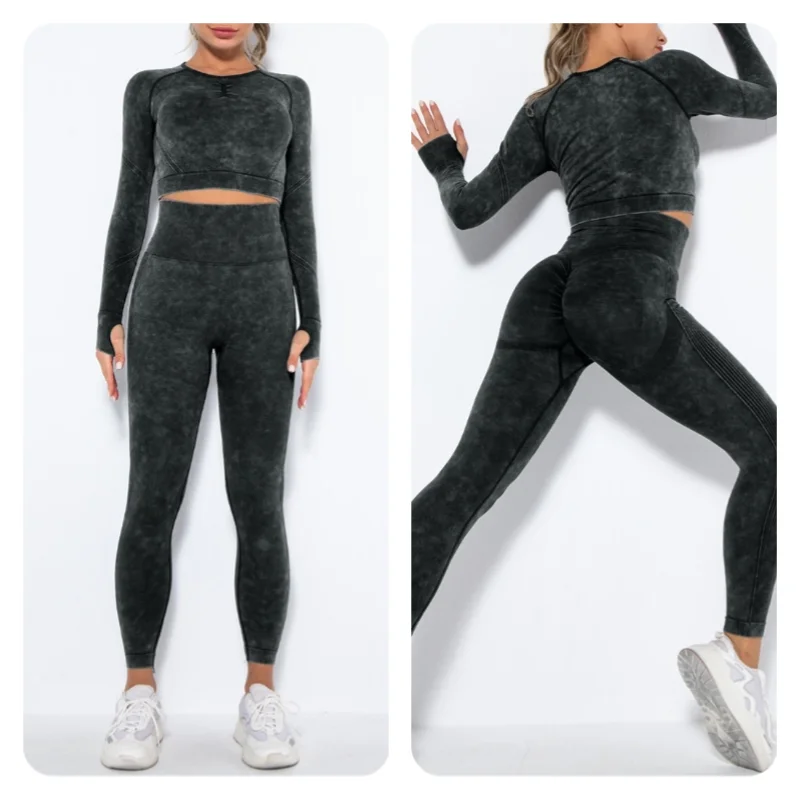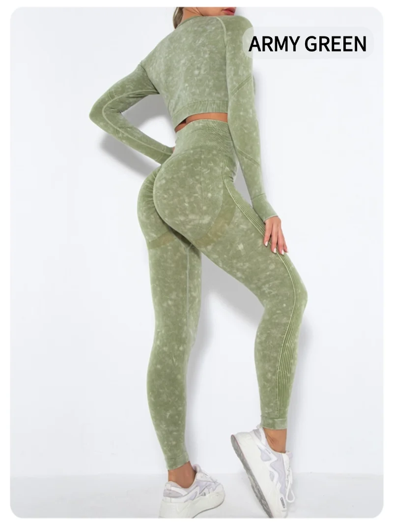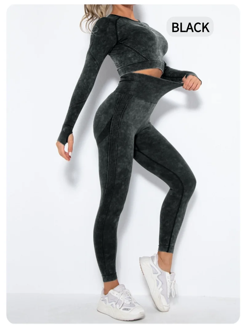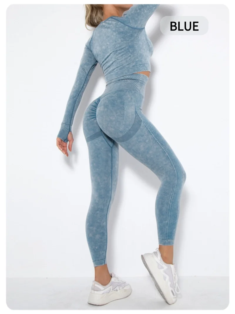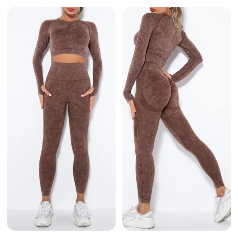 Women's New Seamless Washed Smiling Face Yoga Set, Sports Fitness Long Sleeved Top, Hip Lifting Yoga Pants Two-piece Set