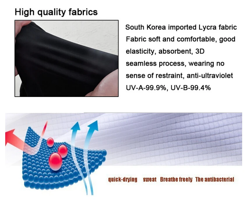 2、High quality fabrics:South Korea imported Lycra fabricFabric soft and comfortable, goodelasticity, absorbent, 3Dseamless process, wearing nosense of restraint, anti-ultravioletUV-A-99.9%,UV-B-99.4%